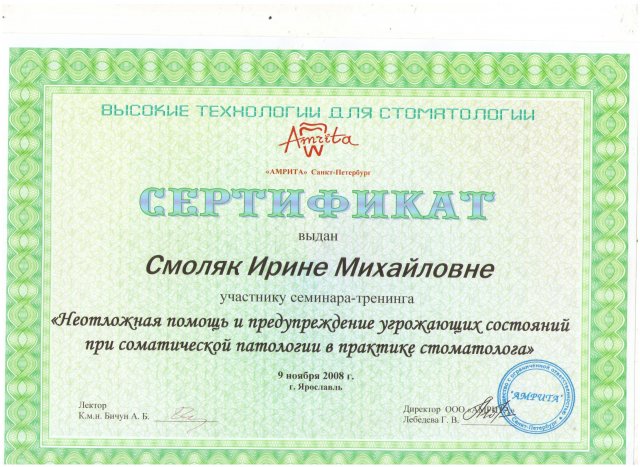 - Семинар-тренинг «Неотложная помощь и предупреждение угрожающих состояний при соматической патологии в практике стоматолога», Бичун А. Б..
